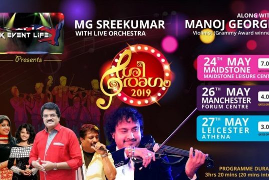 Legendary Indian singer MG Sree Kumar to lead “Sree Ragam 2019” music shows in UK